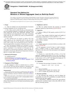 SIGNIFICANCE AND USE 4.1 This test method measures the moisture in mineral aggregate required by Specification D1863/D1863M. SCOPE 1.1 This test method covers the determination of moisture in mineral aggregate for use on built-up roofs. 1.2 The values stated in either SI units or inch-pound units are to be regarded separately as standard. The values stated in each system may not be exact equivalents; therefore, each system shall be used independently of the other. Combining values from the two systems may result in nonconformance with the standard. 1.3 This standard does not purport to address all of the safety concerns, if any, associated with its use. It is the responsibility of the user of this standard to establish appropriate safety, health, and environmental practices and determine the applicability of regulatory limitations prior to use. 1.4 This international standard was developed in accordance with internationally recognized principles on standardization established in the Decision on Principles for the Development of International Standards, Guides and Recommendations issued by the World Trade Organization Technical Barriers to Trade (TBT) Committee.