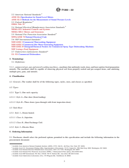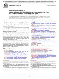 ASTM F1202-22 is a technical specification published by ASTM International. Its full title is "Standard Specification for Washing Machines, Heat Sanitizing, Commercial, Pot, Pan, and Utensil Vertically Oscillating Arm Type". This standard covers: ABSTRACT This specification covers the requirements for manually fed, motor-driven vertically oscillating arm type, automatically controlled, commercial pot, pan, and utensil washing machine (also referred to as "the washer"). The washer is of one rack capacity (Type I) and is available in either Style A (one door/front loading) or Style B (three door/pass-through with front load door). Heat shall be provided to the washer through steam (Style 1) by injection (Class A) or heat exchange coil (Class B) or through electric means (Style 2). The washer and its components shall be manufactured free of defects. Piping and fittings shall be manufactured from corrosion-resisting material or heat-resisting plastic material. Valves, spray assemblies, and overflow drain shall be manufactured from corrosion-resisting materials. Tank and housing shall be constructed of corrosion-resistant steel. Scrap trays (strainers), access door/s, and legs shall be constructed of corrosion-resistant steel or other corrosion-resisting material. The pump motor shall be mounted on the tank or rigid steel base, with the pump casing being of cast iron or corrosion-resisting material. When specified, a final rinse booster heater and/or detergent feeder may be provided. The washer shall be operated at ambient room temperature. Tests for performance standards and operational compliance as well as for noise level, leakage, energy, and productivity requirements shall be performed and shall conform to the requirements specified. SCOPE 1.1 This specification covers manually fed, motor-driven vertically oscillating arm type, automatically controlled, commercial pot, pan, and utensil washing machines, hereinafter referred to as “the washer.” 1.2 The values stated in inch-pound units are to be regarded as standard. The values given in parentheses are mathematical conversions to SI units that are provided for information only and are not considered standard. 1.3 The following precautionary statement pertains only to the test methods portion, Section 9 of this specification: This standard does not purport to address all of the safety concerns, if any, associated with its use. It is the responsibility of the user of this standard to establish appropriate safety, health, and environmental practices and determine the applicability of regulatory limitations prior to use. 1.4 This international standard was developed in accordance with internationally recognized principles on standardization established in the Decision on Principles for the Development of International Standards, Guides and Recommendations issued by the World Trade Organization Technical Barriers to Trade (TBT) Committee.