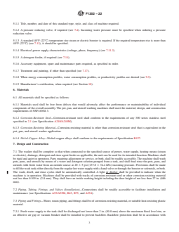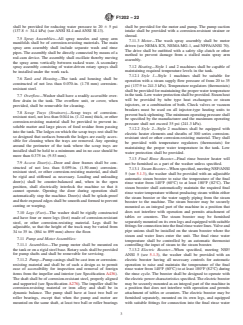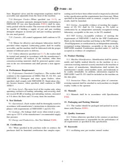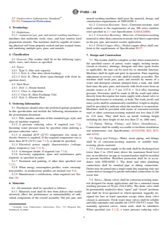 ABSTRACT This specification covers the requirements for manually fed, motor-driven vertically oscillating arm type, automatically controlled, commercial pot, pan, and utensil washing machine (also referred to as "the washer"). The washer is of one rack capacity (Type I) and is available in either Style A (one door/front loading) or Style B (three door/pass-through with front load door). Heat shall be provided to the washer through steam (Style 1) by injection (Class A) or heat exchange coil (Class B) or through electric means (Style 2). The washer and its components shall be manufactured free of defects. Piping and fittings shall be manufactured from corrosion-resisting material or heat-resisting plastic material. Valves, spray assemblies, and overflow drain shall be manufactured from corrosion-resisting materials. Tank and housing shall be constructed of corrosion-resistant steel. Scrap trays (strainers), access door/s, and legs shall be constructed of corrosion-resistant steel or other corrosion-resisting material. The pump motor shall be mounted on the tank or rigid steel base, with the pump casing being of cast iron or corrosion-resisting material. When specified, a final rinse booster heater and/or detergent feeder may be provided. The washer shall be operated at ambient room temperature. Tests for performance standards and operational compliance as well as for noise level, leakage, energy, and productivity requirements shall be performed and shall conform to the requirements specified. SCOPE 1.1 This specification covers manually fed, motor-driven vertically oscillating arm type, automatically controlled, commercial pot, pan, and utensil washing machines, hereinafter referred to as “the washer.” 1.2 The values stated in inch-pound units are to be regarded as standard. The values given in parentheses are mathematical conversions to SI units that are provided for information only and are not considered standard. 1.3 The following precautionary statement pertains only to the test methods portion, Section 9 of this specification: This standard does not purport to address all of the safety concerns, if any, associated with its use. It is the responsibility of the user of this standard to establish appropriate safety, health, and environmental practices and determine the applicability of regulatory limitations prior to use. 1.4 This international standard was developed in accordance with internationally recognized principles on standardization established in the Decision on Principles for the Development of International Standards, Guides and Recommendations issued by the World Trade Organization Technical Barriers to Trade (TBT) Committee.