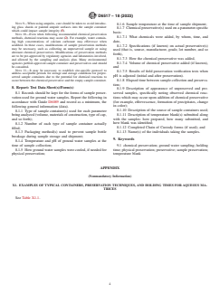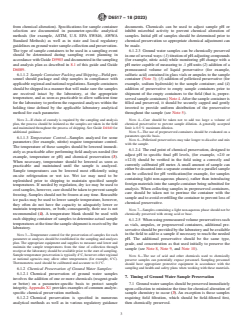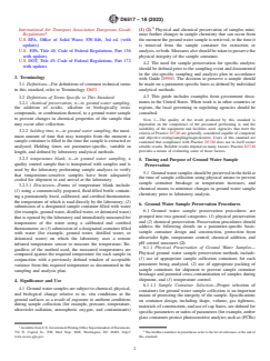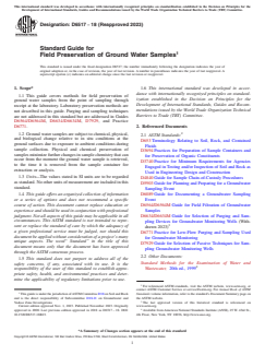 SIGNIFICANCE AND USE 4.1 Ground water samples are subject to chemical, physical, and biological change relative to in- situ conditions at the ground surfaces as a result of exposure to ambient conditions during sample collection (for example, pressure, temperature, ultraviolet radiation, atmospheric oxygen, and contaminants) (1) (2).6 Physical and chemical preservation of samples minimize further changes in sample chemistry that can occur from the moment the ground water sample is retrieved, to the time it is removed from the sample container for extraction or analysis, or both. Measures also should be taken to preserve the physical integrity of the sample container. 4.2 The need for sample preservation for specific analytes should be defined prior to the sampling event and documented in the site-specific sampling and analysis plan in accordance with Guide D5903. The decision to preserve a sample should be made on a parameter-specific basis as defined by individual analytical methods. 4.3 This guide includes examples from government documents in the United States. When work is in other countries or regions, the local governing or regulating agencies should be consulted. Note 1: The quality of the result produced by this standard is dependent on the competence of the personnel performing it, and the suitability of the equipment and facilities used. Agencies that meet the criteria of Practice D3740 are generally considered capable of competent and objective testing/sampling/inspection/etc. Users of this standard are cautioned that compliance with Practice D3740 does not in itself assure reliable results. Reliable results depend on many factors; Practice D3740 provides a means of evaluating some of those factors. SCOPE 1.1 This guide covers methods for field preservation of ground water samples from the point of sampling through receipt at the laboratory. Laboratory preservation methods are not described in this guide. Purging and sampling techniques are not addressed in this standard but are addressed in Guides D6564/D6564M, D6634/D6634M, D7929, and Practice D6771. 1.2 Ground water samples are subject to chemical, physical, and biological change relative to in situ conditions at the ground surfaces due to exposure to ambient conditions during sample collection. Physical and chemical preservation of samples minimize further changes in sample chemistry that can occur from the moment the ground water sample is retrieved, to the time it is removed from the sample container for extraction or analysis. 1.3 Units—The values stated in SI units are to be regarded as standard. No other units of measurement are included in this standard. 1.4 This guide offers an organized collection of information or a series of options and does not recommend a specific course of action. This document cannot replace education or experience and should be used in conjunction with professional judgment. Not all aspects of this guide may be applicable in all circumstances. This ASTM standard is not intended to represent or replace the standard of care by which the adequacy of a given professional service must be judged, nor should this document be applied without consideration of a project's many unique aspects. The word“ Standard” in the title of this document means only that the document has been approved through the ASTM consensus process. 1.5 This standard does not purport to address all of the safety concerns, if any, associated with its use. It is the responsibility of the user of this standard to establish appropriate safety, health, and environmental practices and determine the applicability of regulatory limitations prior to use. 1.6 This international standard was developed in accordance with internationally recognized principles on standardization established in the Decision on Principles for the Development of International Standards, Guides and Recommendations issued by the World Trade Organization Technical ...