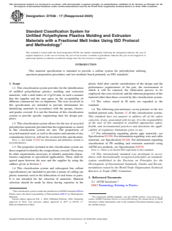ASTM D7436-17(2024) is a standard published by ASTM International. Its full title is "Standard Classification System for Unfilled Polyethylene Plastics Molding and Extrusion Materials with a Fractional Melt Index Using ISO Protocol and Methodology". This standard covers: ABSTRACT This specification is intended to provide a callout system for polyethylene utilizing specimen preparation procedures and test methods based primarily on ISO standards. The classification system provides for the identification of unfilled polyethylene plastics molding and extrusion materials, with a melt index of <1g/10 min, in such a manner that the supplier and the user agree on the acceptability of different commercial lots or shipments. The specification also lists the requirements that would allow for the use of recycled polyethylene materials. These requirements include the colour and form of the material. SCOPE 1.1 This classification system provides for the identification of unfilled polyethylene plastics molding and extrusion materials, with a melt index of 1.2 This classification system allows for the use of recycled polyethylene materials provided that the requirements as stated in this classification system are met. The proportions of recycled material used, as well as the nature and amount of any contaminant, however, will not be covered in this specification. Note 1: See Guide D7209 for information and definitions related to recycled plastics. 1.3 The properties included in this classification system are those required to identify the compositions covered. There may be other requirements necessary to identify particular characteristics important to specialized applications. These shall be agreed upon between the user and the supplier by using the suffixes given in Section 5. 1.4 This classification system and subsequent line callout (specifications) are intended to provide a means of calling out plastic materials used in the fabrication of end items or parts. It is not intended for the selection of materials. Material selection should be made by those having expertise in the plastic field after careful consideration of the design and the performance requirements of the part, the environment to which it will be exposed, the fabrication process to be employed, the costs involved, and the inherent properties of the material other than those covered by this classification system. 1.5 The values stated in SI units are regarded as the standard. 1.6 The following precautionary caveat pertains to the test method portion only, Section 12 of this classification system. This standard does not purport to address all of the safety concerns, if any, associated with its use. It is the responsibility of the user of this standard to establish appropriate safety, health, and environmental practices and determine the applicability of regulatory limitations prior to use. 1.7 For information regarding plastic pipe materials, see Specification D3350. For information regarding wire and cable materials, see Specification D1248. For information regarding classification of PE molding and extrusion materials using ASTM test methods, see Specification D4976. Note 2: There is no known ISO equivalent to this standard. 1.8 This international standard was developed in accordance with internationally recognized principles on standardization established in the Decision on Principles for the Development of International Standards, Guides and Recommendations issued by the World Trade Organization Technical Barriers to Trade (TBT) Committee.
