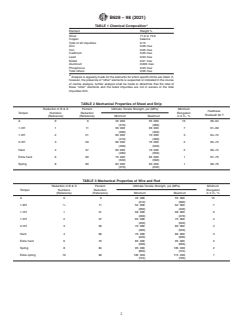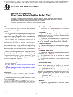 ASTM B628-98(2021) is a technical specification published by ASTM International. Its full title is "Standard Specification for Silver-Copper Eutectic Electrical Contact Alloy". This standard covers: ABSTRACT This specification covers 72% silver-28% copper (eutectic) alloy rod, wire, strip, and sheet material for electrical contacts. The material shall be finished by such operations (cold working, heat treatment, annealing, turning, grinding, or pickling) as are required to produce the prescribed properties. The alloy materials shall conform to the chemical composition and mechanical property requirements. All tests shall be conducted at room temperature. SCOPE 1.1 This specification covers 72 % silver-28 % copper (eutectic) alloy rod, wire, strip, and sheet material for electrical contacts. 1.2 The values stated in inch-pound units are to be regarded as standard. The values given in parentheses are mathematical conversions to SI units that are provided for information only and are not considered standard. 1.3 This standard does not purport to address all of the safety concerns, if any, associated with its use. It is the responsibility of the user of this standard to become familiar with all hazards including those identified in the appropriate Safety Data Sheet (SDS) for this product/material as provided by the manufacturer, to establish appropriate safety, health, and environmental practices, and determine the applicability of regulatory limitations prior to use. 1.4 This international standard was developed in accordance with internationally recognized principles on standardization established in the Decision on Principles for the Development of International Standards, Guides and Recommendations issued by the World Trade Organization Technical Barriers to Trade (TBT) Committee.