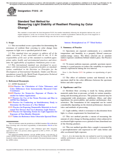 SIGNIFICANCE AND USE 4.1 Resilient floor covering is made by fusing polymer materials under heat or pressure, or both, in various manufacturing and decorating processes. The polymer material may be compounded with plasticizers, stabilizers, fillers, and other ingredients for processability and product performance characteristics. The formulation of the compound can be varied considerably depending on the desired performance characteristics and methods of processing. 4.2 Light stability, which is resistance to discoloration from light, is a basic requirement for functional use. 4.3 This test method provides a means of measuring the amount of color change in flooring products when subjected to accelerated light exposure over a period of time (functional use of the flooring product). 4.4 This test method specifies that a sample is measured by a spectrophotometer and expressed in ΔE* units before and after accelerated light exposure. Note 2: It is the intent that this test method be used for testing light stability performance properties to be referenced in resilient flooring specifications. SCOPE 1.1 This test method covers a procedure for determining the resistance of resilient floor covering to color change from exposure to light over a specified period of time. 1.2 This standard does not purport to address all of the safety concerns, if any, associated with its use. It is the responsibility of the user of this standard to establish appropriate safety, health, and environmental practices and determine the applicability of regulatory limitations prior to use. 1.3 This international standard was developed in accordance with internationally recognized principles on standardization established in the Decision on Principles for the Development of International Standards, Guides and Recommendations issued by the World Trade Organization Technical Barriers to Trade (TBT) Committee.