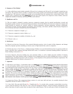 SIGNIFICANCE AND USE 5.1 This test method is designed to produce transverse compressive property data for material specifications, research and development, quality assurance, and structural design and analysis. Factors that influence the transverse compressive response and should therefore be reported are: material, method of material preparation, specimen preparation, specimen conditioning, environment of testing, specimen alignment and gripping, speed of testing, void content, and fiber volume fraction. Properties in the test direction that may be obtained from this test method are: 5.1.1 Transverse compressive strength, σ22uc, 5.1.2 Transverse compressive strain at failure, ε22uc, 5.1.3 Transverse compressive modulus of elasticity, E22, and 5.1.4 Poisson's ratio, γ21. SCOPE 1.1 This test method determines the transverse compressive properties of wound polymer matrix composites reinforced by high-modulus continuous fibers. It describes testing of hoop wound (90°) cylinders in axial compression for determination of transverse compressive properties. 1.2 The technical content of this test method has been stable since 1993 without significant objection from its stakeholders. As there is limited technical support for the maintenance of this test method, changes since that date have been limited to items required to retain consistency with other ASTM D30 Committee standards, including editorial changes and incorporation of updated guidance on specimen preconditioning and environmental testing. The test method, therefore, should not be considered to include any significant changes in approach and practice since 1993. Future maintenance of the test method will only be in response to specific requests and performed only as technical support allows. 1.3 Units—The values stated in either SI units or inch-pound units are to be regarded separately as standard. The values stated in each system are not necessarily exact equivalents; therefore, to ensure conformance with the standard, each system shall be used independently of the other, and values from the two systems shall not be combined. 1.3.1 Within the text, the inch-pound units are shown in brackets. 1.4 This standard does not purport to address all of the safety concerns, if any, associated with its use. It is the responsibility of the user of this standard to establish appropriate safety, health, and environmental practices and determine the applicability of regulatory limitations prior to use. 1.5 This international standard was developed in accordance with internationally recognized principles on standardization established in the Decision on Principles for the Development of International Standards, Guides and Recommendations issued by the World Trade Organization Technical Barriers to Trade (TBT) Committee.