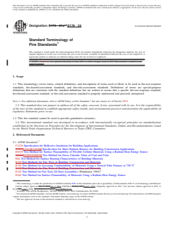 1.1 This terminology covers terms, related definitions, and descriptions of terms used or likely to be used in fire-test-response standards, fire-hazard-assessment standards, and fire-risk-assessment standards. Definitions of terms are special-purpose definitions that are consistent with the standard definitions but are written to ensure that a specific fire-test-response standard, fire-hazard-assessment standard, or fire-risk-assessment standard is properly understood and precisely interpreted.