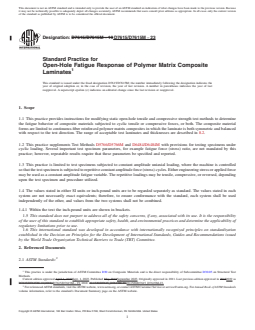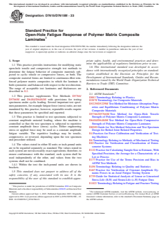 SIGNIFICANCE AND USE 5.1 Refer to Guide D8509. SCOPE 1.1 This practice provides instructions for modifying static open-hole tensile and compressive strength test methods to determine the fatigue behavior of composite materials subjected to cyclic tensile or compressive forces, or both. The composite material forms are limited to continuous-fiber reinforced polymer matrix composites in which the laminate is both symmetric and balanced with respect to the test direction. The range of acceptable test laminates and thicknesses are described in 8.2. 1.2 This practice supplements Test Methods D5766/D5766M and D6484/D6484M with provisions for testing specimens under cyclic loading. Several important test specimen parameters, for example fatigue force (stress) ratio, are not mandated by this practice; however, repeatable results require that these parameters be specified and reported. 1.3 This practice is limited to test specimens subjected to constant amplitude uniaxial loading, where the machine is controlled so that the test specimen is subjected to repetitive constant amplitude force (stress) cycles. Either engineering stress or applied force may be used as a constant amplitude fatigue variable. The repetitive loadings may be tensile, compressive, or reversed, depending upon the test specimen and procedure utilized. 1.4 The values stated in either SI units or inch-pound units are to be regarded separately as standard. The values stated in each system are not necessarily exact equivalents; therefore, to ensure conformance with the standard, each system shall be used independently of the other, and values from the two systems shall not be combined. 1.4.1 Within the text the inch-pound units are shown in brackets. 1.5 This standard does not purport to address all of the safety concerns, if any, associated with its use. It is the responsibility of the user of this standard to establish appropriate safety, health, and environmental practices and determine the applicability of regulatory limitations prior to use. 1.6 This international standard was developed in accordance with internationally recognized principles on standardization established in the Decision on Principles for the Development of International Standards, Guides and Recommendations issued by the World Trade Organization Technical Barriers to Trade (TBT) Committee.