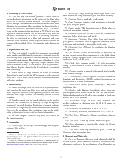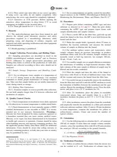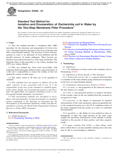 ASTM D5392-24 is a standard published by ASTM International. Its full title is "Standard Test Method for Isolation and Enumeration of <emph type="bdit">Escherichia coli</emph> in Water by the Two-Step Membrane Filter Procedure". This standard covers: SIGNIFICANCE AND USE 5.1 This test method is useful for measuring recreational water quality and chlorinated wastewaters, although it can be used for any water suspected of contamination by fecal wastes of warm-blooded animals. The significance of finding E. coli in recreational water samples, especially samples obtained from fresh recreational waters, is that there is a risk of gastrointestinal illness, directly related to the E. coli density, associated with swimming.5 5.2 Since small or large volumes of water or dilutions thereof can be analyzed by the MF technique, a wider range of levels of E. coli in water can be detected and enumerated than with other methods. SCOPE 1.1 This test method describes a membrane filter (MF) procedure for the detection and enumeration of Escherichia coli, a bacterium found exclusively in the feces of humans and other warm-blooded animals. The presence of these microorganisms in water is an indication of fecal pollution and the possible presence of enteric pathogens. These bacteria are found in water and wastewater in a wide range of densities. The detection limit of this procedure is one colony forming unit (CFU) per volume filtered. 1.2 This test method has been used successfully with temperate fresh and marine ambient waters, and wastewaters. It is the user’s responsibility to ensure the validity of this test method for waters of other types. 1.3 The values stated in SI units are to be regarded as standard. 1.4 This standard does not purport to address all of the safety concerns, if any, associated with its use. It is the responsibility of the user of this standard to establish appropriate safety, health, and environmental practices and determine the applicability of regulatory limitations prior to use. For specific hazard statements, see Section 9. 1.5 This international standard was developed in accordance with internationally recognized principles on standardization established in the Decision on Principles for the Development of International Standards, Guides and Recommendations issued by the World Trade Organization Technical Barriers to Trade (TBT) Committee.