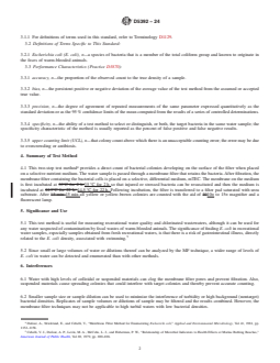 SIGNIFICANCE AND USE 5.1 This test method is useful for measuring recreational water quality and chlorinated wastewaters, although it can be used for any water suspected of contamination by fecal wastes of warm-blooded animals. The significance of finding E. coli in recreational water samples, especially samples obtained from fresh recreational waters, is that there is a risk of gastrointestinal illness, directly related to the E. coli density, associated with swimming.5 5.2 Since small or large volumes of water or dilutions thereof can be analyzed by the MF technique, a wider range of levels of E. coli in water can be detected and enumerated than with other methods. SCOPE 1.1 This test method describes a membrane filter (MF) procedure for the detection and enumeration of Escherichia coli, a bacterium found exclusively in the feces of humans and other warm-blooded animals. The presence of these microorganisms in water is an indication of fecal pollution and the possible presence of enteric pathogens. These bacteria are found in water and wastewater in a wide range of densities. The detection limit of this procedure is one colony forming unit (CFU) per volume filtered. 1.2 This test method has been used successfully with temperate fresh and marine ambient waters, and wastewaters. It is the user’s responsibility to ensure the validity of this test method for waters of other types. 1.3 The values stated in SI units are to be regarded as standard. 1.4 This standard does not purport to address all of the safety concerns, if any, associated with its use. It is the responsibility of the user of this standard to establish appropriate safety, health, and environmental practices and determine the applicability of regulatory limitations prior to use. For specific hazard statements, see Section 9. 1.5 This international standard was developed in accordance with internationally recognized principles on standardization established in the Decision on Principles for the Development of International Standards, Guides and Recommendations issued by the World Trade Organization Technical Barriers to Trade (TBT) Committee.
