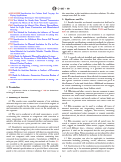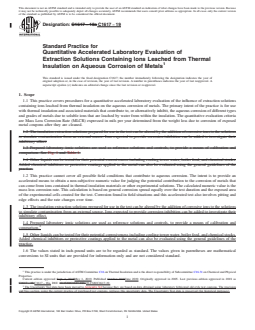 SIGNIFICANCE AND USE 5.1 Results from this accelerated corrosion test shall not be considered as an indicator of the useful life of the metal equipment. Many factors need consideration for applicability to specific circumstances. Refer to Guide C1696 and Practice G31 for additional information. 5.2 Corrosion associated with insulation is an important concern for insulation manufacturers, specification writers, designers, contractors, users and operators of the equipment. Some material specifications contain test methods (or reference test methods contained in other material specifications), for use in evaluating the insulation with regard to the corrosion of steel, copper, and aluminum. In some cases these tests are not applicable or effective and have not been evaluated for precision and bias. 5.3 A properly selected, installed, and maintained insulation system will reduce the corrosion that often occurs on an un-insulated structure. However, when the protective weather-resistant covering of an insulation system fails, the conditions for the aqueous environment necessary for corrosion under insulation (CUI) often develop. It is possible the insulation contains, collects, or concentrates corrosive agents, or a combination thereof, often found in industrial and coastal environments. If water is not present, these electrolytes cannot migrate to the metal surface. The electrochemical reaction resulting in the aqueous corrosion of metal surfaces cannot take place in the absence of water and electrolytes. Additional environmental factors contributing to increased corrosion rates are oxygen, and elevated-temperature (near boiling point). 5.4 Chlorides and other corrosive ions are common to many environments. The primary corrosion preventative is to protect insulation and metal from contamination and moisture. Insulation covers, jackets, and metal coating of various kinds are often used to prevent water infiltration and contact with the metal. 5.5 This procedure can be used to eval... SCOPE 1.1 This practice covers procedures for a quantitative accelerated laboratory evaluation of the influence of extraction solutions containing ions leached from thermal insulation on the aqueous corrosion of metals. The primary intent of the practice is for use with thermal insulation and associated materials that contribute to, or alternatively inhibit, the aqueous corrosion of different types and grades of metals due to soluble ions that are leached by water from within the insulation. The quantitative evaluation criteria are Mass Loss Corrosion Rate (MLCR) expressed in mils per year determined from the weight loss due to corrosion of exposed metal coupons after they are cleaned. 1.2 This practice cannot cover all possible field conditions that contribute to aqueous corrosion. The intent is to provide an accelerated means to obtain a non-subjective numeric value for judging the potential contribution to the corrosion of metals that can come from ions contained in thermal insulation materials or other experimental solutions. The calculated numeric value is the mass loss corrosion rate. This calculation is based on general corrosion spread equally over the test duration and the exposed area of the experimental cells created for the test. Corrosion found in field situations and this accelerated test also involves pitting and edge effects and the rate changes over time. 1.3 The insulation extraction solutions prepared for use in the test can be altered by the addition of corrosive ions to the solutions to simulate contamination from an external source. Ions expected to provide corrosion inhibition can be added to investigate their inhibitory effect. 1.4 Prepared laboratory ionic solutions are used as reference solutions and controls, to provide a means of calibration and comparison.2 1.5 Other liquids can be tested for their potential corrosiveness including cooling tower water, boiler feed, and chemical stocks. ...
