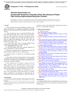 ASTM F1760-16(2020) is a technical specification published by ASTM International. Its full title is "Standard Specification for Coextruded Poly(Vinyl Chloride) (PVC) Non-Pressure Plastic Pipe Having Reprocessed-Recycled Content". This standard covers: ABSTRACT This specification has been published in response to the special circumstance of regulatory requirements regarding federal procurement guidelines for plastic pipe having recycled content. This specification covers coextruded Poly(Vinyl Chloride) (PVC) plastic pipe with a center layer and concentric inner and outer solid layers. The pipe is produced using a multi-layer coextrusion die. The inner and outer layers are made of virgin PVC compound and the center layer has reprocessed-recycled PVC content. The pipe is for nonpressure use in three series: Sewer-Drain series; IPS Schedule 40 series; and IPS Pipe Stiffness (PS) series. Quality control test requirement: nondestructive testing; impact resistance; bond integrity; flattening integrity; pipe stiffness; joint integrity, solvent-cement joints; and joint integrity, elastomeric-gasket joints shall be performed to conform with the specified requirements. SCOPE 1.1 This specification has been published in response to the special circumstance of regulatory requirements regarding federal procurement guidelines for plastic pipe having recycled content. 1.2 This specification covers coextruded Poly(Vinyl Chloride) (PVC) plastic pipe with a center layer and concentric inner and outer solid layers. The pipe is produced using a multi-layer coextrusion die. The inner and outer layers are made of virgin PVC compound and the center layer has reprocessed-recycled PVC content. The pipe is for non-pressure use in three series: 1.2.1 Sewer-Drain series with a sewer-pipe (PSM) outside diameter and a pipe stiffness of 46 psi (320 kPa), 1.2.2 IPS Schedule 40 series, and 1.2.3 IPS Pipe Stiffness (PS) series with pipe stiffnesses of 100 psi (690 kPa) and 120 psi (830 kPa). 1.3 Pipe that is outside-diameter controlled does not have an inside diameter suitable for use as a fitting socket. 1.4 All pipe series are allowed to be perforated during production. 1.5 The values stated in inch-pound units are to be regarded as standard. The values given in parentheses are mathematical conversions to SI units that are provided for information only and are not considered standard. 1.6 This standard does not purport to address all of the safety concerns, if any, associated with its use. It is the responsibility of the user of this standard to establish appropriate safety, health, and environmental practices and determine the applicability of regulatory limitations prior to use. 1.7 This international standard was developed in accordance with internationally recognized principles on standardization established in the Decision on Principles for the Development of International Standards, Guides and Recommendations issued by the World Trade Organization Technical Barriers to Trade (TBT) Committee.