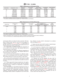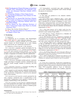 ABSTRACT This specification has been published in response to the special circumstance of regulatory requirements regarding federal procurement guidelines for plastic pipe having recycled content. This specification covers coextruded Poly(Vinyl Chloride) (PVC) plastic pipe with a center layer and concentric inner and outer solid layers. The pipe is produced using a multi-layer coextrusion die. The inner and outer layers are made of virgin PVC compound and the center layer has reprocessed-recycled PVC content. The pipe is for nonpressure use in three series: Sewer-Drain series; IPS Schedule 40 series; and IPS Pipe Stiffness (PS) series. Quality control test requirement: nondestructive testing; impact resistance; bond integrity; flattening integrity; pipe stiffness; joint integrity, solvent-cement joints; and joint integrity, elastomeric-gasket joints shall be performed to conform with the specified requirements. SCOPE 1.1 This specification has been published in response to the special circumstance of regulatory requirements regarding federal procurement guidelines for plastic pipe having recycled content. 1.2 This specification covers coextruded Poly(Vinyl Chloride) (PVC) plastic pipe with a center layer and concentric inner and outer solid layers. The pipe is produced using a multi-layer coextrusion die. The inner and outer layers are made of virgin PVC compound and the center layer has reprocessed-recycled PVC content. The pipe is for non-pressure use in three series: 1.2.1 Sewer-Drain series with a sewer-pipe (PSM) outside diameter and a pipe stiffness of 46 psi (320 kPa), 1.2.2 IPS Schedule 40 series, and 1.2.3 IPS Pipe Stiffness (PS) series with pipe stiffnesses of 100 psi (690 kPa) and 120 psi (830 kPa). 1.3 Pipe that is outside-diameter controlled does not have an inside diameter suitable for use as a fitting socket. 1.4 All pipe series are allowed to be perforated during production. 1.5 The values stated in inch-pound units are to be regarded as standard. The values given in parentheses are mathematical conversions to SI units that are provided for information only and are not considered standard. 1.6 This standard does not purport to address all of the safety concerns, if any, associated with its use. It is the responsibility of the user of this standard to establish appropriate safety, health, and environmental practices and determine the applicability of regulatory limitations prior to use. 1.7 This international standard was developed in accordance with internationally recognized principles on standardization established in the Decision on Principles for the Development of International Standards, Guides and Recommendations issued by the World Trade Organization Technical Barriers to Trade (TBT) Committee.