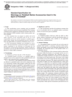ASTM F2904-11(2023): Standard Specification for Warnings on Paintball Marker Accessories Used In the Sport of Paintball establishes minimum requirements for warnings on paintball marker accessories. Developed by ASTM International, this standard ensures that accessories such as barrels, loaders, sights, and other products intended for use with paintball markers provide clear, visible safety warnings. The specification applies specifically to products without existing individual ASTM standards containing product-specific warnings. By harmonizing labeling and cautionary practices, it aims to promote safety and awareness in the sport of paintball.