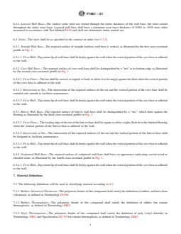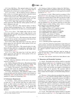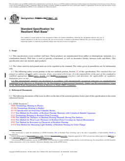 ABSTRACT This specification covers resilient wall base. These products are manufactured from rubber or thermoplastic materials, or a combination thereof. Wall base is used to provide a functional, as well as decorative border, between walls and floors. This specification does not include rigid products. Wall base shall be of the following types, as specified: type TS - rubber, vulcanized thermoset, type TP - rubber, thermoplastic, and type TV - vinyl, thermoplastic. Wall base shall be one of the following groups, as specified: group 1 - solid, and group 2 - layered. Wall base shall be of the following styles as specified: style A - straight, style B - cove, style C - butt-to, style D - sculptured. The wear layer thickness, flexibility, adjacent surface straining induced by wall base, light resistance, chemical resistance, dimensional stability, height, thickness, and length shall be tested to meet the requirements prescribed. SCOPE 1.1 This specification covers resilient wall base. These products are manufactured from rubber or thermoplastic materials, or a combination thereof. Wall base is used to provide a functional, as well as decorative border, between walls and floors. This specification does not include rigid products. 1.2 The values stated in inch-pound units are to be regarded as the standard. The values given in parentheses are for information only. 1.3 The following safety caveat pertains to the test methods portion, Section 12, of this specification: This standard does not purport to address all of the safety concerns, if any, associated with its use. It is the responsibility of the user of this standard to establish appropriate safety, health, and environmental practices and determine the applicability of regulatory limitations prior to use. 1.4 This international standard was developed in accordance with internationally recognized principles on standardization established in the Decision on Principles for the Development of International Standards, Guides and Recommendations issued by the World Trade Organization Technical Barriers to Trade (TBT) Committee.