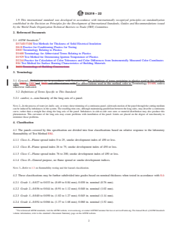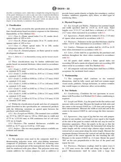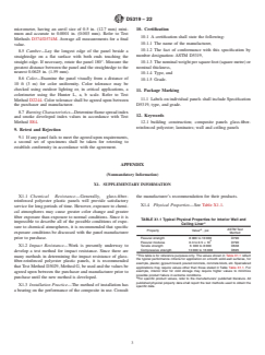 ABSTRACT This specification covers the classification, materials of construction, workmanship, physical requirements, and methods of testing glass-fiber-reinforced polyester composite wall and ceiling panels intended for use in light construction and semi-structural applications. The panels shall be divided into four classifications based on relative response to the laboratory flammability: Class A; Class B; Class C; and Class D. These classifications may be further subdivided into grades based on nominal thickness when tested: Grade 1; Grade 2; Grade 3; Grade 4; Grade 5; Grade 6; and Grade 7. The polyester resin used in the composite shall be a thermosetting polyester resin with cross-linking monomers composed of polymeric esters in which the recurring ester groups are an integral part of the main polymer chain. The resin shall be reinforced with glass fibers. Conditioning; length and width; squareness; thickness; camber; color; impact resistance; and burning characteristics tests shall be performed to conform to the requirements specified. SCOPE 1.1 This specification covers the classification, materials of construction, workmanship, physical requirements, and methods of testing glass-fiber-reinforced polyester composite wall and ceiling panels intended for use in light construction and semi-structural applications. 1.2 Supplementary information on chemical resistance, impact resistance, and installation practice are provided in Appendix X1. 1.3 The classification of these composite panels into classes based on relative response to a laboratory test shall not be considered a fire-hazard classification. 1.4 This specification contains laboratory flammability tests (Test Methods E84 and D1929). In this standard flammability tests are used to measure and describe the response of materials, products, or assemblies to heat and flame under controlled conditions, but do not by themselves incorporate all factors required for fire hazard or fire risk assessment of the materials, products, or assemblies under actual fire conditions. 1.5 The intent of this specification is to define the class, grade, and general laminate properties of the composite wall and ceiling liner panels in order to ensure a quality product which will perform in the intended application. This specification is not intended to restrict or limit technological changes affecting performance when changes are agreed upon between the purchaser and manufacturer. 1.6 The values stated in inch-pound units are to be regarded as the standard. The values given in parentheses are provided for information only. 1.7 The text of this specification references notes and footnotes that provide explanatory material. These notes and footnotes (excluding those in Tables and Figures) shall not be considered as requirements of this specification. 1.8 This standard does not purport to address all of the safety concerns, if any, associated with its use. It is the responsibility of the user of this standard to establish appropriate safety, health, and environmental practices and determine the applicability of regulatory limitations prior to use. Note 1: There is no known ISO equivalent to this standard. 1.9 This international standard was developed in accordance with internationally recognized principles on standardization established in the Decision on Principles for the Development of International Standards, Guides and Recommendations issued by the World Trade Organization Technical Barriers to Trade (TBT) Committee.