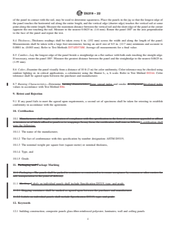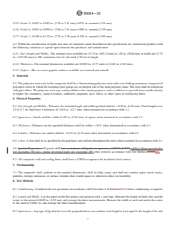 - Physical and Mechanical Testing: Requirements are provided for panel size tolerances, thickness consistency, squareness, camber, impact resistance, and color uniformity. The standard references relevant ASTM test methods for these criteria.