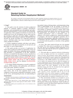 ASTM D6429-23 is the Standard Guide for Selecting Surface Geophysical Methods, developed by ASTM International. This guide aids professionals in the selection of appropriate surface geophysical techniques for geologic, geotechnical, hydrologic, environmental site investigations, as well as forensic and archaeological applications. The standard emphasizes the importance of qualified professionals in method selection and stresses that surface geophysical methods often complement other investigative techniques such as drilling or sampling.