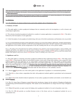 1.3 This guide provides an overview of applications for which surface geophysical methods are appropriate. It does not address the details of the theory underlying specific methods, field procedures, or interpretation of the data. Numerous references are included for that purpose and are considered an essential part of this guide. It is recommended that the user of this guide be familiar with the references cited (1-27)2 and with Guides D420, D5730, D5753, D5777, D6285, D6430, D6431, D6432, D6820, D7046, and D7128, as well as Practices D5088, D5608, D6235, and Test Methods D4428/D4428M, D7400/D7400M, and G57.