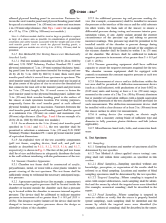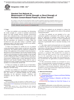 SIGNIFICANCE AND USE 4.1 The purpose of the test methods in this standard is to measure the tensile strength or bond strength of portland cement-based plaster to its substrate. The values obtained using the test methods are not purported to be representative of the actual wind load capacity or other structural properties of a specific portland cement-based plaster installation but may be helpful in assessing such load capacities. 4.2 Because the test methods described in this standard are used for evaluation of portland cement-based plaster cured at least 28 days, load results obtained by either test method must be interpreted based on sound engineering practice, applicable building regulations, and codes having jurisdiction. The decision of whether to use the load results directly or to use the load results as modified by an appropriate safety factor to obtain acceptable working loads is left to the discretion of the test specifier. Determination of an appropriate safety factor shall be left to the discretion of the test specifier. Methods to calculate a safety factor and a maximum permitted working load are provided in the appendixes. 4.3 When the test methods contained in this standard are used on test specimens installed on existing structures, the test results shall not be generalized to a larger wall area without sufficient test sampling. Such efforts should be based on engineering experience and judgment of the test specifier. SCOPE 1.1 These test methods cover procedures for determining the tensile strength of a section of portland cement-based plaster, the bond strength between portland cement-based plaster and a solid plaster base, or the fastener pull-out or lath pull-over strength for portland cement-based plaster bases over framing in either an exterior (stucco) or interior application. The test procedures are destructive in nature within the localized test areas and, after testing is concluded, require appropriate repair of the finish system as well as any underlying materials damaged during testing. 1.2 These test methods are suitable for use on portland cement-based plaster finish systems on both new and existing construction. Test methods shall be conducted a minimum of 28 days after application of the portland cement-based plaster. Mechanical Load Test Method A and Vacuum Chamber Testing shall be used to determine the tensile strength or bond strength of direct-applied portland cement-based plaster and may be useful in evaluating the efficacy of different surface preparation characteristics, bonding agents, or both. Mechanical Load Test Method B and Vacuum Chamber Testing shall be used to determine the tensile strength of portland cement-based plaster installed over mechanically attached lath. 1.3 These test methods are suitable for use in both laboratory and field samples. No correlation shall be made between laboratory and field testing. 1.4 These test methods are not intended to evaluate the performance of the underlying construction or framing members. Test results on a particular building may be variable depending on the specimen location, condition, and installation, and are subject to interpretation by the test specifier. 1.5 These test methods are not intended to evaluate the performance of coatings applied to the surface of the portland cement-based plaster. 1.6 These test methods are not intended to be a pre-construction qualifier to determine if the surfaces are appropriate for application of portland cement plaster. The test methods are intended to be used as a tool to quantitatively evaluate existing portland cement plaster cladding that is suspected of questionable bond or uncertain fastening to the substrate. 1.7 The values stated in inch-pound units are to be regarded as standard. The values given in parentheses are mathematical conversions to SI units that are provided for information only and are not considered standard. 1.8 This standard may involve...