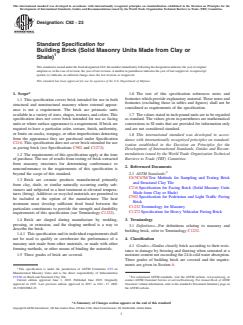 ABSTRACT This specification covers building bricks intended for use in structural and nonstructural masonry where external appearance is not a requirement. The bricks are prismatic units available in a variety of sizes, shapes, textures, and colors and are manufactured from clay, shale, or similar naturally occurring earthy substances by firing. The heat treatment should develop sufficient fired bond between material particulates to produce a material that conforms to the required strength and durability. During manufacture, the breaks are shaped by molding, pressing, or extrusion. Bricks are classified into grades according to their resistance to damage by freezing when wet. All the materials should comply with the requirements on appearance, durability, absorption alternate, freezing and thawing alternative, breakage, cracking, weathering index alternative, strength, and initial absorption rate. SCOPE 1.1 This specification covers brick intended for use in both structural and nonstructural masonry where external appearance is not a requirement. The brick are prismatic units available in a variety of sizes, shapes, textures, and colors. This specification does not cover brick intended for use as facing units or where surface appearance is a requirement. If brick are required to have a particular color, texture, finish, uniformity, or limits on cracks, warpage, or other imperfections detracting from the appearance they are purchased under Specification C216. This specification does not cover brick intended for use as paving brick (see Specifications C902 and C1272). 1.2 The requirements of this specification apply at the time of purchase. The use of results from testing of brick extracted from masonry structures for determining conformance or nonconformance to the requirements of this specification is beyond the scope of this standard. 1.3 Brick are ceramic products manufactured primarily from clay, shale, or similar naturally occurring earthy substances and subjected to a heat treatment at elevated temperatures (firing). Additives or recycled materials are permitted to be included at the option of the manufacturer. The heat treatment must develop sufficient fired bond between the particulate constituents to provide the strength and durability requirements of this specification (see Terminology C1232). 1.4 Brick are shaped during manufacture by molding, pressing, or extrusion, and the shaping method is a way to describe the brick. 1.4.1 This specification and its individual requirements shall not be used to qualify or corroborate the performance of a masonry unit made from other materials, or made with other forming methods, or other means of binding the materials. 1.5 Three grades of brick are covered. 1.6 The text of this specification references notes and footnotes which provide explanatory material. These notes and footnotes (excluding those in tables and figures) shall not be considered as requirements of the specification. 1.7 The values stated in inch-pound units are to be regarded as standard. The values given in parentheses are mathematical conversions to SI units that are provided for information only and are not considered standard. 1.8 This international standard was developed in accordance with internationally recognized principles on standardization established in the Decision on Principles for the Development of International Standards, Guides and Recommendations issued by the World Trade Organization Technical Barriers to Trade (TBT) Committee.