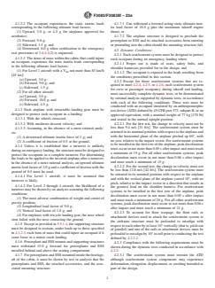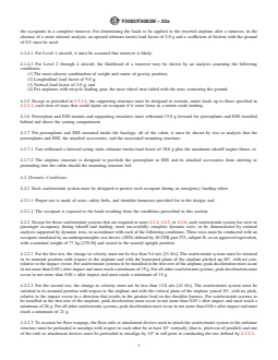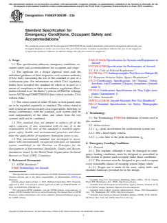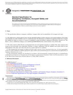 ABSTRACT This specification covers emergency conditions, occupant safety and accommodations for occupants and cargo. The applicant for a design approval must seek the individual guidance of their respective civil aviation authority (CAA) body concerning the use of this standard as part of a certification plan. SCOPE 1.1 This specification addresses emergency conditions, occupant safety and accommodations for occupants and cargo. 1.2 The applicant for a design approval must seek the individual guidance of their respective civil aviation authority (CAA) body concerning the use of this standard as part of a certification plan. For information on which CAA regulatory bodies have accepted this standard (in whole or in part) as a means of compliance to their airworthiness regulations (Hereinafter referred to as “the Rules”), refer to ASTM F44 webpage (www.ASTM.org/COMITTEE/F44.htm) which includes CAA website links. 1.3 The values stated in either SI units or inch-pound units are to be regarded separately as standard. The values stated in each system are not necessarily exact equivalents; therefore, to ensure conformance with the standard, each system shall be used independently of the other, and values from the two systems shall not be combined. 1.4 This standard does not purport to address all of the safety concerns, if any, associated with its use. It is the responsibility of the user of this standard to establish appropriate safety, health, and environmental practices and determine the applicability of regulatory limitations prior to use. 1.5 This international standard was developed in accordance with internationally recognized principles on standardization established in the Decision on Principles for the Development of International Standards, Guides and Recommendations issued by the World Trade Organization Technical Barriers to Trade (TBT) Committee.