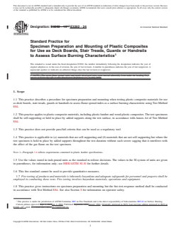 1.1 This practice describes a procedure for specimen preparation and mounting when testing plastic composite materials for use as deck boards, stair treads, guards or handrails to assess flame spread index as a surface burning characteristic using Test Method E84.