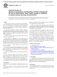 ASTM E3202-24: Standard Practice for Specimen Preparation and Mounting of Plastic Composites for Use as Deck Boards, Stair Treads, Guards or Handrails to Assess Surface Burning Characteristics provides a standardized procedure for preparing and mounting plastic composite specimens for fire testing. This ASTM standard is essential for manufacturers, builders, and safety professionals working with plastic composite materials-such as plastic lumber and wood-plastic composites-for use as exterior and interior building components.