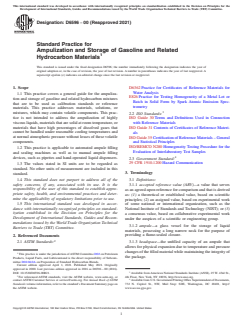 ASTM D6596-00(2021), "Standard Practice for Ampulization and Storage of Gasoline and Related Hydrocarbon Materials," provides guidance on the secure packaging and long-term storage of gasoline and similar liquid hydrocarbons as calibration standards or reference materials (RMs). This standard practice is designed to minimize variability and maintain integrity when preparing and storing volatile hydrocarbon mixtures, which are essential for calibration of analytical instruments and validation of test methods in laboratories. Both manual and automated ampule filling and sealing processes are addressed, emphasizing the importance of homogeneity, stability, and contamination prevention throughout the procedure.