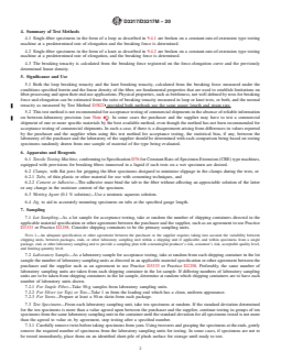 SIGNIFICANCE AND USE 5.1 Both the loop breaking tenacity and the knot breaking tenacity, calculated from the breaking force measured under the conditions specified herein and the linear density of the fiber, are fundamental properties that are used to establish limitations on fiber-processing and upon their end-use applications. Physical properties, such as brittleness, not well defined by tests for breaking force and elongation can be estimated from the ratio of breaking tenacity measured in loop or knot tests, or both, and the normal tenacity as measured by Test Method D3822 provided both methods use the same gauge length and strain rate. 5.2 This test method is not recommended for acceptance testing of commercial shipments in the absence of reliable information on between-laboratory precision (see Note 3). In some cases the purchaser and the supplier may have to test a commercial shipment of one or more specific materials by the best available method, even though the method has not been recommended for acceptance testing of commercial shipments. In such a case, if there is a disagreement arising from differences in values reported by the purchaser and the supplier when using this test method for acceptance testing, the statistical bias, if any, between the laboratory of the purchaser and the laboratory of the supplier should be determined with each comparison being based on testing specimens randomly drawn from one sample of material of the type being evaluated. SCOPE 1.1 These test methods cover the measurement of the breaking tenacity of manufactured textile fibers taken from filament yarns, staple, or tow fiber, either crimped or uncrimped, and tested in either a double loop or as a strand formed into a single overhand knot. 1.2 Methods for measuring the breaking tenacity of conditioned and wet (immersed) fibers in loop and knot form are included. 1.3 Elongation in loop or knot tests has no known significance, and is usually not recorded. 1.4 The basic distinction between the procedures described in these test methods and those included in Test Methods D2101 is the configuration of the specimen, that is, either as a double loop or in the configuration of a single overhand knot. 1.5 The values stated in either SI units or inch-pound units are to be regarded separately as standard. The values stated in each system are not necessarily exact equivalents; therefore, to ensure conformance with the standard, each system shall be used independently of the other, and values from the two systems shall not be combined. 1.6 This standard does not purport to address all of the safety concerns, if any, associated with its use. It is the responsibility of the user of this standard to establish appropriate safety, health, and environmental practices and determine the applicability of regulatory limitations prior to use. 1.7 This international standard was developed in accordance with internationally recognized principles on standardization established in the Decision on Principles for the Development of International Standards, Guides and Recommendations issued by the World Trade Organization Technical Barriers to Trade (TBT) Committee.