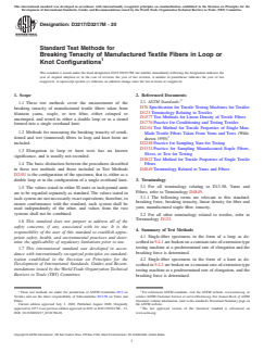 ASTM D3217/D3217M-20 is a standard published by ASTM International. Its full title is "Standard Test Methods for Breaking Tenacity of Manufactured Textile Fibers in Loop or Knot Configurations". This standard covers: SIGNIFICANCE AND USE 5.1 Both the loop breaking tenacity and the knot breaking tenacity, calculated from the breaking force measured under the conditions specified herein and the linear density of the fiber, are fundamental properties that are used to establish limitations on fiber-processing and upon their end-use applications. Physical properties, such as brittleness, not well defined by tests for breaking force and elongation can be estimated from the ratio of breaking tenacity measured in loop or knot tests, or both, and the normal tenacity as measured by Test Method D3822 provided both methods use the same gauge length and strain rate. 5.2 This test method is not recommended for acceptance testing of commercial shipments in the absence of reliable information on between-laboratory precision (see Note 3). In some cases the purchaser and the supplier may have to test a commercial shipment of one or more specific materials by the best available method, even though the method has not been recommended for acceptance testing of commercial shipments. In such a case, if there is a disagreement arising from differences in values reported by the purchaser and the supplier when using this test method for acceptance testing, the statistical bias, if any, between the laboratory of the purchaser and the laboratory of the supplier should be determined with each comparison being based on testing specimens randomly drawn from one sample of material of the type being evaluated. SCOPE 1.1 These test methods cover the measurement of the breaking tenacity of manufactured textile fibers taken from filament yarns, staple, or tow fiber, either crimped or uncrimped, and tested in either a double loop or as a strand formed into a single overhand knot. 1.2 Methods for measuring the breaking tenacity of conditioned and wet (immersed) fibers in loop and knot form are included. 1.3 Elongation in loop or knot tests has no known significance, and is usually not recorded. 1.4 The basic distinction between the procedures described in these test methods and those included in Test Methods D2101 is the configuration of the specimen, that is, either as a double loop or in the configuration of a single overhand knot. 1.5 The values stated in either SI units or inch-pound units are to be regarded separately as standard. The values stated in each system are not necessarily exact equivalents; therefore, to ensure conformance with the standard, each system shall be used independently of the other, and values from the two systems shall not be combined. 1.6 This standard does not purport to address all of the safety concerns, if any, associated with its use. It is the responsibility of the user of this standard to establish appropriate safety, health, and environmental practices and determine the applicability of regulatory limitations prior to use. 1.7 This international standard was developed in accordance with internationally recognized principles on standardization established in the Decision on Principles for the Development of International Standards, Guides and Recommendations issued by the World Trade Organization Technical Barriers to Trade (TBT) Committee.