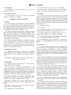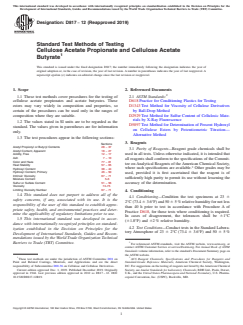 ASTM D817-12(2019) is a standard published by ASTM International. Its full title is "Standard Test Methods of Testing Cellulose Acetate Propionate and Cellulose Acetate Butyrate". This standard covers: SIGNIFICANCE AND USE 7.1 Ash content gives an estimate of the inorganic content of cellulose ester samples. The presence of high levels of inorganic content (ash) can be detrimental to the melt stability and optical clarity of a cellulose ester in melt processing or act as a potential source of insolubles when the ester is used in solution. SCOPE 1.1 These test methods cover procedures for the testing of cellulose acetate propionates and acetate butyrates. These esters may vary widely in composition and properties, so certain of the procedures can be used only in the ranges of composition where they are suitable. 1.2 The values stated in SI units are to be regarded as the standard. The values given in parentheses are for information only. 1.3 The test procedures appear in the following sections: Sections Acetyl Propionyl or Butyryl Contents 28 – 37 Acetyl Content, Apparent 18 – 27 Acidity, Free 12 – 17 Ash 7 – 10 Color and Haze 77 – 81 Heat Stability 57 – 65 Hydroxyl Content 38 – 44 Hydroxyl Content, Primary 46 – 50 Intrinsic Viscosity 67 – 71 Moisture Content 5-6 Sulfur or Sulfate Content 51 – 56 Viscosity 74-75 Limiting Viscosity Number 67 – 71 1.4 This standard does not purport to address all of the safety concerns, if any, associated with its use. It is the responsibility of the user of this standard to establish appropriate safety, health, and environmental practices and determine the applicability of regulatory limitations prior to use. 1.5 This international standard was developed in accordance with internationally recognized principles on standardization established in the Decision on Principles for the Development of International Standards, Guides and Recommendations issued by the World Trade Organization Technical Barriers to Trade (TBT) Committee.