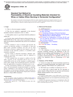 ASTM D7936-20 is a standard published by ASTM International. Its full title is "Standard Test Method for Flammability of Electrical Insulating Materials Intended for Wires or Cables When Burning in Horizontal Configuration". This standard covers: SIGNIFICANCE AND USE 5.1 This horizontal flame test method measures the ability of the material to cease flaming when the source of ignition used is removed. 5.2 This test method also provides a measure of the capability of the material to spread flame by dripping of flaming particles. 5.3 This test method is used to assess the horizontal flame test performance of electrical insulation materials in Test Methods D470. 5.4 In this test method, the test specimens are subjected to one or more specific sets of laboratory test conditions. If different test conditions are substituted or the end-use conditions are changed, it is not always possible by or from this test to predict changes in the fire-test-response characteristics measured. The results are therefore valid only for the fire-test-exposure conditions described in this test method. SCOPE 1.1 This is a fire-test-response standard. 1.2 This fire test method is applicable to the electrical insulation materials contained in wires or cables. 1.3 The ignition source is a gas burner fueled by methane or natural gas. 1.4 Use the values stated in SI units in referee decisions; see IEEE/ASTM SI-10. The values given in parentheses after SI units are provided for information only and are not considered standard. 1.5 This standard is used to measure and describe the response of materials, products, or assemblies to heat and flame under controlled conditions, but does not by itself incorporate all factors required for fire hazard or fire risk assessment of the materials, products, or assemblies under actual fire conditions. 1.6 Fire testing is inherently hazardous. Adequate safeguards for personnel and property shall be employed in conducting these tests. 1.7 This standard does not purport to address all of the safety concerns, if any, associated with its use. It is the responsibility of the user of this standard to establish appropriate safety, health, and environmental practices and determine the applicability of regulatory limitations prior to use. 1.8 This international standard was developed in accordance with internationally recognized principles on standardization established in the Decision on Principles for the Development of International Standards, Guides and Recommendations issued by the World Trade Organization Technical Barriers to Trade (TBT) Committee.