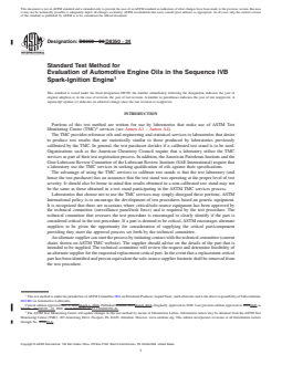 ASTM D8350-24 is a standard published by ASTM International. Its full title is "Standard Test Method for Evaluation of Automotive Engine Oils in the Sequence IVB Spark-Ignition Engine". This standard covers: SIGNIFICANCE AND USE 5.1 This test method was developed to evaluate automotive lubricant’s effect on controlling valve-train wear and overall engine wear for overhead camshaft engines with direct acting bucket lifters. 5.2 Average intake lifter volume loss is used as a measure of an oil’s ability to prevent valve-train wear. 5.3 End-of-test oil iron concentration is used as a measure of an oil’s ability to prevent overall engine wear. Note 2: This test method may be used for engine oil specifications such as API SP, and ILSAC GF- 6A, and GF-6B. SCOPE 1.1 This test method measures the ability of an engine crankcase oil to control valve-train wear in spark-ignition engines at low operating temperature conditions. This test method is designed to simulate extended engine cyclic vehicle operation. The Sequence IVB Test Method uses a Toyota 2NR-FE water cooled, 4 cycle, in-line cylinder, 1.5 L engine. The primary result is bucket lifter wear. Secondary results include cam lobe nose wear and measurement of iron (Fe) wear metal concentration in the used engine oil. Other determinations such as fuel dilution of the crankcase oil, non-ferrous wear metal concentrations, total fuel consumption, and total oil consumption, can be useful in the assessment of the validity of the test results.2 1.2 The values stated in SI units are to be regarded as standard. No other units of measurement are included in this standard. 1.2.1 Exceptions—Where there is no direct SI equivalent such as pipe fittings, tubing, NPT screw threads/diameters, or single source equipment specified. 1.3 This standard does not purport to address all of the safety concerns, if any, associated with its use. It is the responsibility of the user of this standard to establish appropriate safety, health, and environmental practices and determine the applicability of regulatory limitations prior to use. Specific warning statements are provided throughout this document as necessary in each particular section. 1.4 This international standard was developed in accordance with internationally recognized principles on standardization established in the Decision on Principles for the Development of International Standards, Guides and Recommendations issued by the World Trade Organization Technical Barriers to Trade (TBT) Committee.