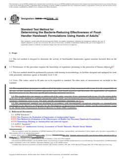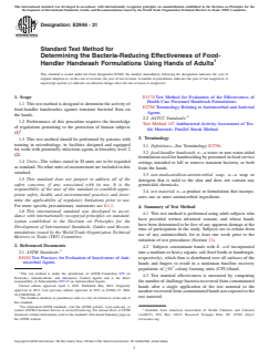 ASTM E2946-21 is a standard published by ASTM International. Its full title is "Standard Test Method for Determining the Bacteria-Reducing Effectiveness of Food-Handler Handwash Formulations Using Hands of Adults". This standard covers: SIGNIFICANCE AND USE 5.1 Hand hygiene is considered one of the most important measures for preventing the spread of infectious microorganisms and is critical for reducing the incidence of food-borne disease. Food-handling settings are unique in that moderate to heavy soil load present on hands often can influence the ability of a product to remove or kill microorganisms (3, 4). Test methods are needed for assessing the efficacy of hand hygiene products under conditions representative of those encountered in a food-handling environment. 5.2 This test method is specifically designed to evaluate the effectiveness of food-handler products to kill and remove bacteria from experimentally-contaminated hands under conditions of moderate to heavy organic soil load. The inclusion of soils typical of food service setting makes this a methodology more appropriate than Test Method E1174, which was designed to evaluate healthcare personnel hand washes and does not include an option to include soil (4). SCOPE 1.1 This test method is designed to determine the activity of food-handler handwashes against transient bacterial flora on the hands. 1.2 Performance of this procedure requires the knowledge of regulations pertaining to the protection of human subjects (1)2. 1.3 This test method should be performed by persons with training in microbiology, in facilities designed and equipped for work with potentially infectious agents at biosafety level 2 (2). 1.4 Units—The values stated in SI units are to be regarded as standard. No other units of measurement are included in this standard. 1.5 This standard does not purport to address all of the safety concerns, if any, associated with its use. It is the responsibility of the user of this standard to establish appropriate safety, health, and environmental practices and determine the applicability of regulatory limitations prior to use. For more specific precautionary statements see 8.1.1. 1.6 This international standard was developed in accordance with internationally recognized principles on standardization established in the Decision on Principles for the Development of International Standards, Guides and Recommendations issued by the World Trade Organization Technical Barriers to Trade (TBT) Committee.