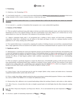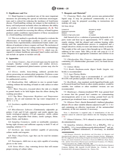SIGNIFICANCE AND USE 5.1 Hand hygiene is considered one of the most important measures for preventing the spread of infectious microorganisms and is critical for reducing the incidence of food-borne disease. Food-handling settings are unique in that moderate to heavy soil load present on hands often can influence the ability of a product to remove or kill microorganisms (3, 4). Test methods are needed for assessing the efficacy of hand hygiene products under conditions representative of those encountered in a food-handling environment. 5.2 This test method is specifically designed to evaluate the effectiveness of food-handler products to kill and remove bacteria from experimentally-contaminated hands under conditions of moderate to heavy organic soil load. The inclusion of soils typical of food service setting makes this a methodology more appropriate than Test Method E1174, which was designed to evaluate healthcare personnel hand washes and does not include an option to include soil (4). SCOPE 1.1 This test method is designed to determine the activity of food-handler handwashes against transient bacterial flora on the hands. 1.2 Performance of this procedure requires the knowledge of regulations pertaining to the protection of human subjects (1)2. 1.3 This test method should be performed by persons with training in microbiology, in facilities designed and equipped for work with potentially infectious agents at biosafety level 2 (2). 1.4 Units—The values stated in SI units are to be regarded as standard. No other units of measurement are included in this standard. 1.5 This standard does not purport to address all of the safety concerns, if any, associated with its use. It is the responsibility of the user of this standard to establish appropriate safety, health, and environmental practices and determine the applicability of regulatory limitations prior to use. For more specific precautionary statements see 8.1.1. 1.6 This international standard was developed in accordance with internationally recognized principles on standardization established in the Decision on Principles for the Development of International Standards, Guides and Recommendations issued by the World Trade Organization Technical Barriers to Trade (TBT) Committee.