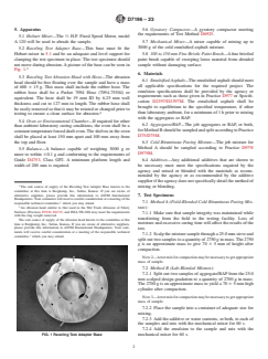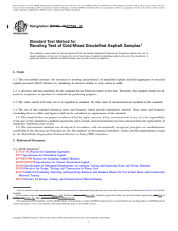 SIGNIFICANCE AND USE 4.1 This test is useful for classifying the curing and formulation of cold-mixed emulsified asphalt samples through ravel testing of compacted specimens. This performance test should be used to rank the mix conditions and approximate curing time for return to traffic and resistance to weather damage. Note 1: The quality of the results produced by this standard are dependent on the competence of the personnel performing the procedure and the capability, calibration, and maintenance of the equipment used. Agencies that meet the criteria of Specification D3666 are generally considered capable of competent and objective testing, sampling, inspection, etc. Users of this standard are cautioned that compliance with Specification D3666 alone does not completely ensure reliable results. Reliable results depend on many factors; following the suggestions of Specification D3666 or some similar acceptable guideline provides a means of evaluating and controlling some of those factors. SCOPE 1.1 This test method measures the resistance to raveling characteristics of emulsified asphalt and field aggregates or recycled asphalt pavement (RAP) mixtures by simulating an abrasion similar to early return to traffic. 1.2 A precision and bias statement for this standard has not been developed at this time. Therefore, this standard should not be used for acceptance or rejection of a material for purchasing purposes. 1.3 The values stated in SI units are to be regarded as standard. No other units of measurement are included in this standard. 1.4 The text of this standard references notes and footnotes which provide explanatory material. These notes and footnotes (excluding those in tables and figures) shall not be considered as requirements of the standard. 1.5 This standard does not purport to address all of the safety concerns, if any, associated with its use. It is the responsibility of the user of this standard to establish appropriate safety, health, and environmental practices and determine the applicability of regulatory limitations prior to use. 1.6 This international standard was developed in accordance with internationally recognized principles on standardization established in the Decision on Principles for the Development of International Standards, Guides and Recommendations issued by the World Trade Organization Technical Barriers to Trade (TBT) Committee.