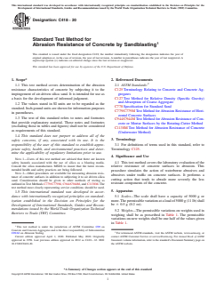 ASTM C418-20 is a standard published by ASTM International. Its full title is "Standard Test Method for Abrasion Resistance of Concrete by Sandblasting". This standard covers: SIGNIFICANCE AND USE 4.1 This test method covers the laboratory evaluation of the relative resistance of concrete surfaces to abrasion. This procedure simulates the action of waterborne abrasives and abrasives under traffic on concrete surfaces. It performs a cutting action that tends to abrade more severely the less resistant components of the concrete. SCOPE 1.1 This test method covers determination of the abrasion resistance characteristics of concrete by subjecting it to the impingement of air-driven silica sand. It is intended for use as a basis for the development of informed judgment. 1.2 The values stated in SI units are to be regarded as the standard. Inch-pound units are shown for information purposes in parentheses. 1.3 The text of this standard refers to notes and footnotes that provide explanatory material. These notes and footnotes (excluding those in tables and figures) shall not be considered as requirements of this standard. 1.4 This standard does not purport to address all of the safety concerns, if any, associated with its use. It is the responsibility of the user of this standard to establish appropriate safety, health, and environmental practices and determine the applicability of regulatory limitations prior to use. Note 1: Users of this test method are advised that there are known safety hazards associated with the use of silica as a blasting media. Consult the silica manufactures MSDS to insure that the latest recommended health and safety practices are being followed. Note 2: Other procedures are available for measuring abrasion resistance of concrete surfaces in addition to subjecting it to air driven silica sand. Consideration should be given to other methods of testing as outlined in Test Methods C779/C779M, C944/C944M, and C1138M. The test method most closely representing service conditions should be used. 1.5 This international standard was developed in accordance with internationally recognized principles on standardization established in the Decision on Principles for the Development of International Standards, Guides and Recommendations issued by the World Trade Organization Technical Barriers to Trade (TBT) Committee.