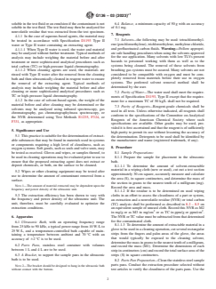 ASTM G136-03(2023)e1 is a standard published by ASTM International. Its full title is "Standard Practice for Determination of Soluble Residual Contaminants in Materials by Ultrasonic Extraction". This standard covers: SIGNIFICANCE AND USE 5.1 This practice is suitable for the determination of extractable substances that may be found in materials used in systems or components requiring a high level of cleanliness, such as oxygen systems. Soft goods, such as seals and valve seats, may be tested as received. Gloves and wipes, or samples thereof, to be used in cleaning operations may be evaluated prior to use to ensure that the proposed extracting agent does not extract or deposit chemicals, or both, on the surface to be cleaned. 5.2 Wipes or other cleaning equipment may be tested after use to determine the amount of contaminant removed from a surface. Note 1: The amount of material extracted may be dependent upon the frequency and power density of the ultrasonic unit. 5.3 The extraction efficiency has been shown to vary with the frequency and power density of the ultrasonic unit. The unit, therefore, must be carefully evaluated to optimize the extraction conditions. SCOPE 1.1 This practice may be used to extract nonvolatile and semivolatile residues from materials such as new and used gloves, new and used wipes, component soft goods, and so forth. When used with proposed cleaning materials (wipes, gloves, and so forth), this practice may be used to determine the potential of the proposed solvent or other fluids to extract contaminants (plasticizers, residual detergents, brighteners, and so forth) and deposit them on the surface being cleaned. 1.2 This practice is not suitable for the evaluation of particulate contamination. 1.3 The values stated in SI units are to be regarded standard. No other units of measurement are included in this standard. 1.4 This standard does not purport to address all of the safety concerns, if any, associated with its use. It is the responsibility of the user of this standard to establish appropriate safety, health, and environmental practices and determine the applicability of regulatory limitations prior to use. 1.5 This international standard was developed in accordance with internationally recognized principles on standardization established in the Decision on Principles for the Development of International Standards, Guides and Recommendations issued by the World Trade Organization Technical Barriers to Trade (TBT) Committee.