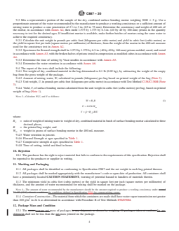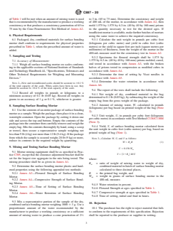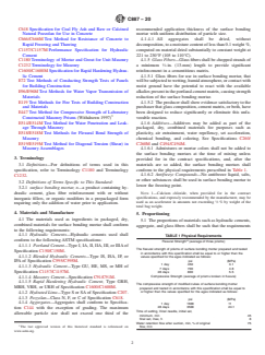 ABSTRACT This specification covers the materials, properties, and packaging of dry, combined materials for use as surface bonding mortar with concrete masonry units that have not been prefaced, coated, or painted. The materials used as ingredients shall consist of the following: cements which shall be a Portland cement, blended hydraulic cement, hydraulic cement, or masonry cement; Type S or SA hydrated lime; Class N, F, or S pozzolan; aggregates; glass fibers; and additives. Physical properties of the packaged materials shall conform to the flexural strength, compressive strength, time of setting, and water retention requirements. The net weight, amount of mixing water, unit weight, and yield of the surface bonding mortar shall be calculated and reported. SCOPE 1.1 This specification covers the materials, properties, and packaging of dry, combined materials for use as surface bonding mortar with concrete masonry units that have not been prefaced, coated, or painted. 1.2 This specification does not cover design or application. Consult the manufacturer for specific recommendations. 1.3 Appendix X1 of this specification contains the recommended tests for evaluation of surface bonded masonry assemblages used to establish design loads for the composite wall. 1.4 Appendix X2 through Appendix X5 of this specification contain additional tests that may be performed on surface bonding mortar. 1.5 The values stated in inch-pound units are to be regarded as standard. The values given in parentheses are mathematical conversions to SI units that are provided for information only and are not considered standard. 1.6 This standard does not purport to address all of the safety concerns, if any, associated with its use. It is the responsibility of the user of this standard to establish appropriate safety, health, and environmental practices and determine the applicability of regulatory limitations prior to use. This hazard statement applies only to Section 9 of this specification. 1.7 This international standard was developed in accordance with internationally recognized principles on standardization established in the Decision on Principles for the Development of International Standards, Guides and Recommendations issued by the World Trade Organization Technical Barriers to Trade (TBT) Committee.