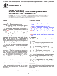 ASTM D6683-19 is a standard published by ASTM International. Its full title is "Standard Test Method for Measuring Bulk Density Values of Powders and Other Bulk Solids as Function of Compressive Stress". This standard covers: SIGNIFICANCE AND USE 5.1 The data from this test can be used to estimate the bulk density of materials in bins and hoppers and for material handling applications such as feeders. 5.2 The test results can be greatly affected by the sample selected for testing. For meaningful results it is necessary to select a representative sample of the particulate solid with respect to moisture (water) content, particle-size distribution and temperature. For the tests an appropriate size sample should be available, and fresh material should be used for each individual test specimen. 5.3 Initial bulk density, (ρb)initial, may or may not be used as the minimum bulk density. This will depend on the material being tested. For example, the two are often close to the same for coarse (most particles larger than about 6 mm), free-flowing bulk solids, but not for fine, aeratable powders. 5.4 Bulk density values may be dependent upon the magnitude of the applied mass increments. Traditionally, the applied mass is doubled for each increment resulting in an applied mass increment ratio of 1. Smaller than standard increment ratios may be desirable for materials that are highly sensitive to the applied mass increment ratio. An example of the latter is a material whose bulk density increases 10% or more with each increase in applied mass. 5.5 Bulk density values may be dependent upon the duration of each applied mass. Traditionally, the duration is the same for each increment and equal to 15 s. For some materials, the rate of compression is such that complete compression (no change in volume with time at a given applied compressive stress) will require significantly more than 15 s. Note 1: The quality of the result produced by this standard is dependent on the competence of personnel performing it, and the suitability of the equipment and facilities used. Agencies that meet the criteria of Practice D3740 are generally considered capable of competent and objective testing/sampling/inspection/etc. Users ... SCOPE 1.1 This test method covers an apparatus and procedure for determining a range of bulk densities of powders and other bulk solids as a function of compressive stress. 1.2 This test method should be performed in the laboratory under controlled conditions of temperature and humidity. 1.3 All observed and calculated values shall conform to the guidelines for significant digits and rounding established in Practice D6026. 1.3.1 The procedures used to specify how data are collected/recorded or calculated in this standard are regarded as the industry standard. In addition, they are representative of the significant digits that generally should be retained. The procedures used do not consider material variation, purpose for obtaining the data, special purpose studies, or any considerations for the user’s objectives, and it is common practice to increase or reduce significant digits of reported data to be commensurate with these considerations. It is beyond the scope of this standard to consider significant digits used in analysis methods for engineering design. 1.4 Units—The values stated in SI units are to be regarded as standard. No other units of measure are included in this standard. 1.5 This standard does not purport to address all of the safety concerns, if any, associated with its use. It is the responsibility of the user of this standard to establish appropriate safety, health, and environmental practices and determine the applicability of regulatory limitations prior to use. 1.6 This international standard was developed in accordance with internationally recognized principles on standardization established in the Decision on Principles for the Development of International Standards, Guides and Recommendations issued by the World Trade Organization Technical Barriers to Trade (TBT) Committee.