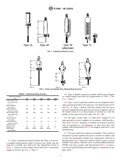 ASTM E1096-86(2024) is a technical specification published by ASTM International. Its full title is "Standard Specification for Laboratory Glass Separatory Funnels". This standard covers: ABSTRACT This specification provides standard dimensional requirements for glass separatory funnels for general laboratory use. Separatory funnels shall be in the following types: Type 1A; Type 1B; Type 1C; Type 2; Type 3; and Type 4. Separatory funnels shall be made of borosilicate glass conforming to the requirement specified. The design of each separatory funnels shall comply with the dimensions given in each requirements. SCOPE 1.1 This specification provides standard dimensional requirements for glass separatory funnels for general laboratory use. 1.2 This international standard was developed in accordance with internationally recognized principles on standardization established in the Decision on Principles for the Development of International Standards, Guides and Recommendations issued by the World Trade Organization Technical Barriers to Trade (TBT) Committee.