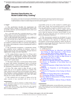 ASTM B994/B994M-22 is a technical specification published by ASTM International. Its full title is "Standard Specification for Nickel-Cobalt Alloy Coating". This standard covers: ABSTRACT This specification outlines the requirements for corrosion-resistant coatings of electrodeposited nickel-cobalt on metallic substrates and electrodeposited nickel-cobalt used for electroforming. It includes an accelerated exposure test method to evaluate the effects of corrosion and galling on the nickel-cobalt alloy coating, as well as a means of reporting the results to the purchaser. This specification incorporates a classification scheme that establishes service condition by thickness, classes of deposits based on the level of monitoring, and type based on supplemental coatings used after deposition. It also provides requirements for materials and manufacture; acceptance tests in terms of appearance, adhesion, and coating thickness, qualification tests (galling test, chemical composition, hydrogen embrittlement test, corrosion testing, environmental testing, third party reports, frequency of qualification tests); sampling; rejection; and certification. SCOPE 1.1 This specification describes the requirements for corrosion-resistant coatings of electrodeposited nickel-cobalt on metallic substrates and electrodeposited nickel-cobalt used for electroforming. Note 1: The nickel-cobalt alloy is principally deposited as a coating on steel products. It can also be electrodeposited on iron, stainless steel, aluminum, titanium, and any other metal substrate. Note 2: The nickel-cobalt alloy coating has a low coefficient of friction of 0.08 that provides a dry lubricant on part surfaces that are in contact with each other and are subject to galling. 1.2 This specification incorporates an accelerated exposure test method to evaluate the effects of corrosion and galling on the coating, and incorporates a means of reporting the results to the purchaser. 1.3 The specification incorporates a classification scheme that establishes service conditions for thickness, classes of deposits based on the level of monitoring, and type based on supplemental coatings used after deposition. 1.4 The coating thickness ranges from 5 to >30 μm, and it can be applied to machined parts, springs, latches, threaded parts, fasteners, etc. The deposit can also be used to electroform parts requiring high strength with the alloy being maintained at 50 % nickel-cobalt. 1.5 The nickel-cobalt alloy is used to protect ferrous metals in contact with corrosive environments such as: oil and gas production facilities, coastal marine, and ACQ (Alkaline Copper Quaternary) treatments for wood treatments. 1.6 Units—The values stated in either SI units or inch-pound units are to be regarded separately as standard. The values stated in each system are not necessarily exact equivalents; therefore, to ensure conformance with the standard, each system shall be used independently of the other, and values from the two systems shall not be combined. 1.7 This standard does not purport to address all of the safety concerns, if any, associated with its use. It is the responsibility of the user of this standard to establish appropriate safety, health, and environmental practices and determine the applicability of regulatory limitations prior to use. 1.8 This standard has been revised to comply with the Restriction of Hazardous Substances RoHS Requirements that seek to limit the exposure of workers and the public to toxic metals. The nickel-cobalt alloy does not contain any of the six Restricted Hazardous Substances. 1.9 This international standard was developed in accordance with internationally recognized principles on standardization established in the Decision on Principles for the Development of International Standards, Guides and Recommendations issued by the World Trade Organization Technical Barriers to Trade (TBT) Committee.