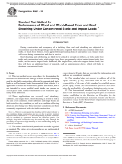 ASTM E661-22 is a standard published by ASTM International. Its full title is "Standard Test Method for Performance of Wood and Wood-Based Floor and Roof Sheathing Under Concentrated Static and Impact Loads". This standard covers: SIGNIFICANCE AND USE 5.1 The procedures outlined will provide data that can be used to evaluate the structural performance, under concentrated loads, of roof and floor sheathing, separate from the effects of the framing, under simulated conditions representative of those in actual service. 5.2 The procedures are intended to be applied to roof or floor sheathing materials installed directly to framing. They are not intended for the evaluation of the framed assembly as a whole. SCOPE 1.1 This test method covers procedures for determining the resistance to deflection and damage of floor and roof sheathing used in site-built construction subjected to concentrated static loads as well as impact loads from nonrigid blunt objects. It is applicable to wood and wood-based panels and boards, but is not intended to cover profiled metal decks, nor precast or cast-in-place slabs. Surface indentation is not evaluated separately from deflection. 1.2 Three applications are covered: roof sheathing, subfloors, and single floors. Roof sheathing is tested in both a dry and a wet condition, while subfloors and single floors are both tested in a dry condition, as well as a condition of having dried out after being wet. These moisture conditions are those commonly experienced with site-built construction. Note 1: Where it is anticipated that sheathing will be subjected only to dry conditions during construction and use, or else to greater moisture exposure than is indicated in 7.3.2, the corresponding exposure conditions may be modified by agreement between the interested parties. For example, shop-built construction may be tested dry only, although the possibility of exposure to high humidity or leaks and flooding during use should be considered. 1.3 The values stated in inch-pound units are to be regarded as standard. The values given in parentheses are mathematical conversions to SI units that are provided for information only and are not considered standard. 1.4 This standard does not purport to address all of the safety concerns, if any, associated with its use. It is the responsibility of the user of this standard to establish appropriate safety, health, and environmental practices and determine the applicability of regulatory limitations prior to use. 1.5 This international standard was developed in accordance with internationally recognized principles on standardization established in the Decision on Principles for the Development of International Standards, Guides and Recommendations issued by the World Trade Organization Technical Barriers to Trade (TBT) Committee.