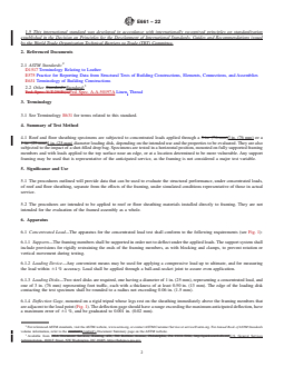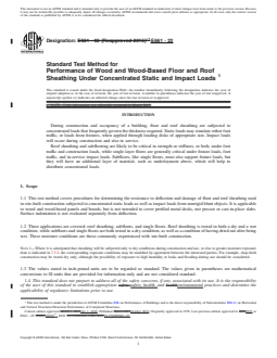 SIGNIFICANCE AND USE 5.1 The procedures outlined will provide data that can be used to evaluate the structural performance, under concentrated loads, of roof and floor sheathing, separate from the effects of the framing, under simulated conditions representative of those in actual service. 5.2 The procedures are intended to be applied to roof or floor sheathing materials installed directly to framing. They are not intended for the evaluation of the framed assembly as a whole. SCOPE 1.1 This test method covers procedures for determining the resistance to deflection and damage of floor and roof sheathing used in site-built construction subjected to concentrated static loads as well as impact loads from nonrigid blunt objects. It is applicable to wood and wood-based panels and boards, but is not intended to cover profiled metal decks, nor precast or cast-in-place slabs. Surface indentation is not evaluated separately from deflection. 1.2 Three applications are covered: roof sheathing, subfloors, and single floors. Roof sheathing is tested in both a dry and a wet condition, while subfloors and single floors are both tested in a dry condition, as well as a condition of having dried out after being wet. These moisture conditions are those commonly experienced with site-built construction. Note 1: Where it is anticipated that sheathing will be subjected only to dry conditions during construction and use, or else to greater moisture exposure than is indicated in 7.3.2, the corresponding exposure conditions may be modified by agreement between the interested parties. For example, shop-built construction may be tested dry only, although the possibility of exposure to high humidity or leaks and flooding during use should be considered. 1.3 The values stated in inch-pound units are to be regarded as standard. The values given in parentheses are mathematical conversions to SI units that are provided for information only and are not considered standard. 1.4 This standard does not purport to address all of the safety concerns, if any, associated with its use. It is the responsibility of the user of this standard to establish appropriate safety, health, and environmental practices and determine the applicability of regulatory limitations prior to use. 1.5 This international standard was developed in accordance with internationally recognized principles on standardization established in the Decision on Principles for the Development of International Standards, Guides and Recommendations issued by the World Trade Organization Technical Barriers to Trade (TBT) Committee.