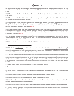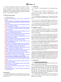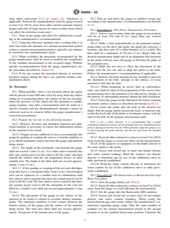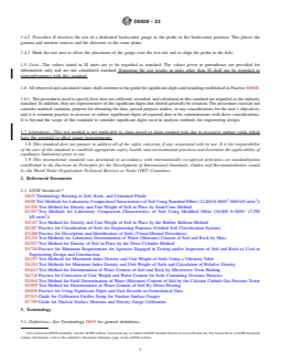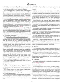 SIGNIFICANCE AND USE 4.1 The test method described is useful as a rapid, nondestructive technique for in-place measurements of wet density and water content of soil and soil-aggregate and the determination of dry density. 4.2 The test method is used for quality control and acceptance testing of compacted soil and soil-aggregate mixtures as used in construction and also for research and development. The nondestructive nature allows repetitive measurements at a single test location and statistical analysis of the results. 4.3 Density—The fundamental assumptions inherent in the methods are that Compton scattering is the dominant interaction and that the material is homogeneous. 4.4 Water Content—The fundamental assumptions inherent in the test method are that the hydrogen ions present in the soil or soil-aggregate are in the form of water as defined by the water content derived from Test Methods D2216, and that the material is homogeneous. (See 5.2) Note 1: The quality of the result produced by this standard test method is dependent on the competence of the personnel performing it, and the suitability of the equipment and facilities used. Agencies that meet the criteria of Practice D3740 are generally considered capable of competent and objective testing/sampling/inspection, and the like. Users of this standard are cautioned that compliance with Practice D3740 does not in itself ensure reliable results. Reliable results depend on many factors; Practice D3740 provides a means of evaluating some of those factors. SCOPE 1.1 This test method describes the procedures for measuring in-place density and moisture of soil and soil-aggregate by use of nuclear equipment (hereafter referred to as “gauge”). The density of the material may be measured by direct transmission, backscatter, or backscatter/air-gap ratio methods. Measurements for water (moisture) content are taken at the surface in backscatter mode regardless of the mode being used for density. 1.1.1 For limitations see Section 5 on Interferences. 1.2 The total or wet density of soil and soil-aggregate is measured by the attenuation of gamma radiation where, in direct transmission, the source is placed at a known depth up to 300 mm (12 in.) and the detector(s) remains on the surface (some gauges may reverse this orientation); or in backscatter or backscatter/air-gap the source and detector(s) both remain on the surface. 1.2.1 The density of the test sample in mass per unit volume is calculated by comparing the detected rate of gamma radiation with previously established calibration data. 1.2.2 The dry density of the test sample is obtained by subtracting the water mass per unit volume from the test sample wet density (Section 11). Most gauges display this value directly. 1.3 The gauge is calibrated to read the water mass per unit volume of soil or soil-aggregate. When divided by the density of water and then multiplied by 100, the water mass per unit volume is equivalent to the volumetric water content. The water mass per unit volume is determined by the thermalizing or slowing of fast neutrons by hydrogen, a component of water. The neutron source and the thermal neutron detector are both located at the surface of the material being tested. The water content most prevalent in engineering and construction activities is known as the gravimetric water content, w, and is the ratio of the mass of the water in pore spaces to the total mass of solids, expressed as a percentage. 1.4 Two alternative procedures are provided. 1.4.1 Procedure A describes the direct transmission method in which the probe extends through the base of the gauge into a pre-formed hole to a desired depth. The direct transmission is the preferred method. 1.4.2 Procedure B involves the use of a dedicated backscatter gauge or the probe in the backscatter position. This places the gamma and neutron sources and the detectors in the same plane. 1.4.3 Mark the test area ...