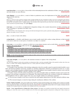 ASTM D7722-22 is a standard published by ASTM International. Its full title is "Standard Terminology Relating to Assembly of Textile Structures". This standard covers: SCOPE 1.1 This terminology identifies industrial terms related to stitches and seams that are used for the assembly of textile structures. 1.2 Section 3, Terminology, is categorized into two subsections, specific to the two areas of specialization under this document. 1.2.1 Section 3.1 Relating to Seams. 1.2.2 Section 3.2 Relating to Stitches. 1.3 For other terms relating to textiles refer to Terminology D123. 1.4 This international standard was developed in accordance with internationally recognized principles on standardization established in the Decision on Principles for the Development of International Standards, Guides and Recommendations issued by the World Trade Organization Technical Barriers to Trade (TBT) Committee.
