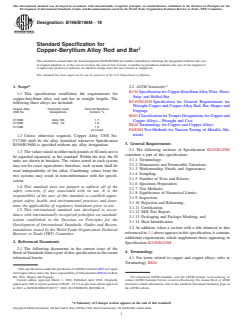 ASTM B196/B196M-18 is a technical specification published by ASTM International. Its full title is "Standard Specification for Copper-Beryllium Alloy Rod and Bar". This standard covers: ABSTRACT This specification establishes the requirements for rods and bars in straight lengths of copper-beryllium alloys with Copper Alloy UNS Nos. C17000, C17200, and C17300. The material for manufacture shall be cast and worked to such purity and soundness as to be suitable for processing by hot working, cold working, and annealing to produce a uniform wrought structure and specified temper in the finished product. Products shall be available in the following tempers: solution heat-treated TB00 (A), and cold-drawn hard TD04 (H), which shall be precipitation heat treated after machining or forming. Products that are already precipitation heat treated by the manufacturer shall be available in tempers TF00 (AT) and TH04 (HT). Products shall be sampled and prepared, then tested accordingly to examine their conformance to dimensional (diameter, length, straightness, and edge contour), mechanical (tensile and yield strength, Rockwell hardness, and elongation), and chemical composition requirements. SCOPE 1.1 This specification establishes the requirements for copper-beryllium alloy rod and bar in straight lengths. The following three alloys are included: Copper Alloy UNS No. Previously Used Designations Nominal Beryllium Content, % C17000 Alloy 165 1.7 C17200 Alloy 25 1.9 C17300 1.9 +0.4 lead 1.2 Unless otherwise required, Copper Alloy UNS No. C17200 shall be the alloy furnished whenever Specification B196/B196M is specified without any alloy designation. 1.3 The values stated in either inch-pounds or SI units are to be regarded separately as the standard. Within the text, the SI units are shown in brackets. The values stated in each system may not be exact equivalents; therefore, each system shall be used independently of the other. Combining values from the two systems may result in nonconformance with the specification. 1.4 This standard does not purport to address all of the safety concerns, if any, associated with its use. It is the responsibility of the user of this standard to establish appropriate safety, health, and environmental practices and determine the applicability of regulatory limitations prior to use. 1.5 This international standard was developed in accordance with internationally recognized principles on standardization established in the Decision on Principles for the Development of International Standards, Guides and Recommendations issued by the World Trade Organization Technical Barriers to Trade (TBT) Committee.