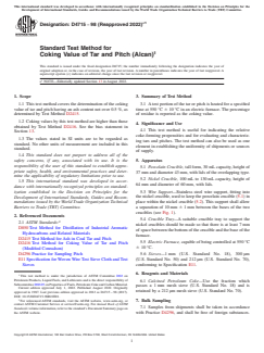 ASTM D4715-98(2022)e1: Standard Test Method for Coking Value of Tar and Pitch (Alcan) is an internationally recognized standard developed by ASTM International. This test method provides procedures to determine the coking value of tar and pitch samples with low ash content (not exceeding 0.5%), offering a reliable indication of their coke-forming properties. The coking value is an important parameter for evaluating and characterizing tars and pitches in various industrial applications. This standard supports quality control, specification compliance, and consistency in the supply chain for materials used in coke production and related processes.