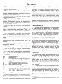 SIGNIFICANCE AND USE 5.1 Sediment exposure evaluations are a critical component for both ecological and human health risk assessments. Credible, cost-effective methods are required to determine the rate and extent of bioaccumulation given the potential importance of bioaccumulation by benthic organisms. Standardized test methods to assess the bioavailability of sediment-associated contaminants are required to assist in the development of sediment quality guidelines (1, 2, 3)5 and to assess the potential impacts of disposal of dredge materials (4). 5.2 The extent to which sediment-associated contaminants are biologically available and bioaccumulated is important in order to assess their direct effects on sediment-dwelling organisms and assess their transport to higher trophic levels. Controlled studies are required to determine the potential for bioaccumulation that can be interpreted and modeled for predicting the impact of accumulated chemicals. The data collected by these methods should be correlated with the current understanding of toxicity or human health risks to augment the hazard interpretation for contaminated sediments. SCOPE 1.1 This guide covers procedures for measuring the bioaccumulation of sediment-associated contaminants by infaunal invertebrates. Marine, estuarine, and freshwater sediments are a major sink for chemicals that sorb preferentially to particles, such as organic compounds with high octanol-water-partitioning coefficients (Kow) (for example, polychlorinated biphenyls (PCBs) and dichlorodiphenyltrichloroethane (DDT)) and many metals. The accumulation of chemicals into whole or bedded sediments (that is, consolidated rather than suspended sediments) reduces their direct bioavailability to pelagic organisms but increases the exposure of benthic organisms. Feeding of pelagic organisms on benthic prey can reintroduce sediment-associated contaminants into pelagic food webs. The bioaccumulation of sediment-associated contaminants by sediment-dwelling organisms can therefore result in ecological impacts on benthic and pelagic communities and human health from the consumption of contaminated shellfish or pelagic fish. 1.2 Methods of measuring bioaccumulation by infaunal organisms from marine, estuarine, and freshwater sediments containing organic or metal contaminates will be discussed. The procedures are designed to generate quantitative estimates of steady-state tissue residues because data from bioaccumulation tests are often used in ecological or human health risk assessments. Eighty percent of steady-state is used as the general criterion. Because the results from a single or few species are often extrapolated to other species, the procedures are designed to maximize exposure to sediment-associated contaminants so that residues in untested species are not underestimated systematically. A 28-day exposure with sediment-ingesting invertebrates and no supplemental food is recommended as the standard single sampling procedure. Procedures for long-term and kinetic tests are provided for use when 80 % of steady-state will not be obtained within 28 days or when more precise estimates of steady-state tissue residues are required. The procedures are adaptable to shorter exposures and different feeding types. Exposures shorter than 28 days may be used to identify which compounds are bioavailable (that is, bioaccumulation potential) or for testing species that do not live for 28 days in the sediment (for example, certain Chironomus). Non-sediment-ingestors or species requiring supplementary food may be used if the goal is to determine uptake in these particular species because of their importance in ecological or human health risk assessments. However, the results from such species should not be extrapolated to other species. 1.3 Standard test methods are still under development, and much of this guide is based on techniques used in successful studies and expert opinion rather than experimen...