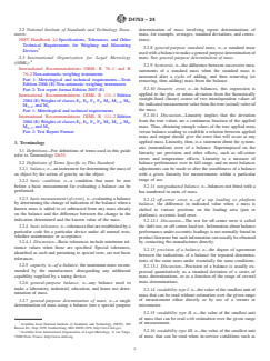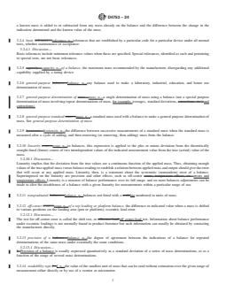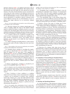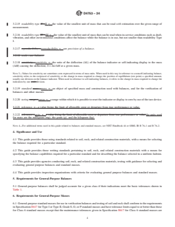 SIGNIFICANCE AND USE 4.1 This guide provides those using standards related to soil, rock, and related construction materials, with a means for selecting the balance required for a particular standard. 4.2 This guide provides those writing standards pertaining to soil, rock, and related construction materials with a means for specifying the balance capabilities required for a particular standard and for describing the balance selected in a uniform fashion. 4.3 This guide provides agencies conducting soil, rock, and related construction materials, testing with guidance for selecting and evaluating general purpose balances and standard masses. 4.4 This guide provides inspection organizations with criteria for evaluating general purpose balances and standard masses. SCOPE 1.1 This guide provides minimum requirements for general-purpose balances and standard masses used in testing soil, rock, and related construction materials. 1.2 This guide provides guidance for evaluating, selecting, and specifying general purpose balances and standard masses used in testing soil, rock, and related construction materials. 1.3 The accuracy requirements for balances are specified in terms of the combined effect of all sources of error contributing to overall balance performance. The measurement of specific sources of error and consideration of details pertaining to balance construction has been intentionally avoided. 1.4 This guide does not include requirements for balances having accuracies greater than those generally required in testing soil, rock, and related construction materials or for research programs or specialized testing requirements. 1.5 This guide does not apply to nongraduated balances. 1.6 This guide does not address the methods used to verify or quantify specific parameters dealing with balances. For a description of tests used in evaluating balance performance, see NIST Handbook 44. 1.7 This guide is not intended to be used as a specification for the purchase of balances. Note 1: The National Institute of Standards and Technology (NIST), formerly the National Bureau of Standards (NBS), and the International Organization of Legal Metrology (OIML) publish standards or practices that specify construction requirements as well as performance guides for balances. ASTM, OIML, and NIST publish construction standards and tolerances for standard masses. Note 2: The terms “mass” and “determine the mass of” are used in this standard instead of the more commonly used terms “weight” and “weigh” to comply with standard metric practice. In addition, the term “standard mass(es)” is used instead of “standard weight(s)” when referring to a piece of material of known specified mass used to compare or measure the mass of other masses. 1.8 The values states in SI units are to be regarded as standard. 1.9 This guide offers an organized collection of information or a series of options and does not recommend a specific course of action. This document cannot replace education or experience and should be used in conjunction with professional judgment. Not all aspects of this guide may be applicable in all circumstances. This ASTM standard is not intended to represent or replace the standard of care by which the adequacy of a given professional service must be judged nor should this document be applied without consideration of a project's many unique aspects. The word “Standard” in the title of this document means only that the document has been approved through the ASTM consensus process. 1.10 This standard does not purport to address all of the safety concerns, if any, associated with its use. It is the responsibility of the user of this standard to establish appropriate safety, health, and environmental practices and determine the applicability of regulatory limitations prior to use. 1.11 This international standard was developed in accordance with internationally recognized principles on standard...
