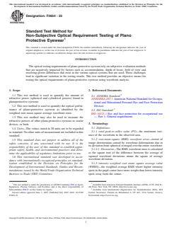 ASTM F3654-23 is a standard published by ASTM International. Its full title is "Standard Test Method for Non-Subjective Optical Requirement Testing of Plano Protective Eyewear". This standard covers: SIGNIFICANCE AND USE 5.1 This test method offers a procedure for evaluation of the refractive components of plano-protective eyewear. 5.2 This test method has been specifically designed for protective eyewear that will not fit into conventional automatic/digital focimeters. 5.3 This test method has been designed to provide a determination of the image formation quality of plano-protective eyewear. 5.4 This test method offers a comprehensive refractive power measurement scanning protocol that measures the refractive power over a total 50 mm2 area in front of each eye. This measurement protocol known as the Multiple Gaze Direction Detailed Scan (MGDDS) measures the refractive powers of the zones of the plano-protective eyewear that are typically used as the wearer performs micro eye movements. SCOPE 1.1 This test method is used to quantify the amount of refractive power (spherical and cylindrical powers) found in planoprotective eyewear. 1.2 This test method is used to quantify the optical performance of plano-protective eyewear as identified by the weighted root mean square average wavefront error. 1.3 This test method may also be used to measure the refractive powers of other plano-protective eyewear or ocular devices, or both. 1.4 Units—The values stated in SI units are to be regarded as standard. No other units of measurement are included in this standard. 1.5 This standard does not purport to address all of the safety concerns, if any, associated with its use. It is the responsibility of the user of this standard to establish appropriate safety, health, and environmental practices and determine the applicability of regulatory limitations prior to use. 1.6 This international standard was developed in accordance with internationally recognized principles on standardization established in the Decision on Principles for the Development of International Standards, Guides and Recommendations issued by the World Trade Organization Technical Barriers to Trade (TBT) Committee.